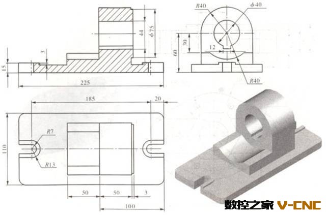 注意:在看零件图的过程中,上述步骤不能把它们机械地分开,往往是参差进行的。对于有些表达不够理想的零件图,需要反复仔细地分析思考,才能看懂。具体大家可以参考下边这张零件图来学习如何读零件图: