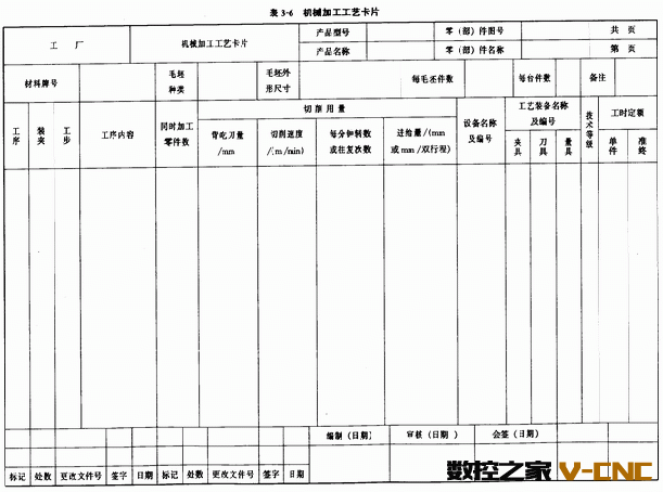 机械加工工艺卡片是以工序为单位,详细地说明整个工艺过程的一种工艺文件。它是用来指导工人生产和帮助车间管理人员和技术人员掌握整个零件加工过程的一种主要技术文件,是广泛用于成批生产的零件和重要零件的小批生产中。机械加工工艺卡片内容包括零件的材料、重量、毛坯种类、工序号、工序名称、工序内容、工艺参数、操作要求以及采用的设备和工艺装备等。机械加工工艺卡片格式见表 3-6 所示。