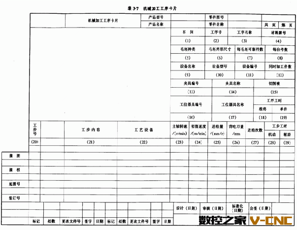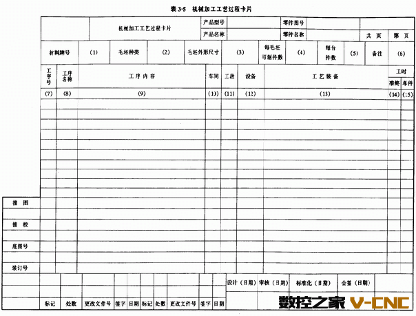 这种卡片以工序为单位,简要地列出整个零件加工所经过的工艺路线(包括毛坯制造、机械加工和热处理等)。它是制订其它工艺文件的基础,也是生产准备、编排作业计划和组织生产的依据。在这种卡片中,由于各工序的说明不够具体,故一般不直接指导工人操作,而多作为生产管理方面使用。但在单件小批生产中。由于通常不编制其它较详细的工艺文件,而就以这种卡片指导生产。机械加工工艺过程卡片见表 3-5所示。