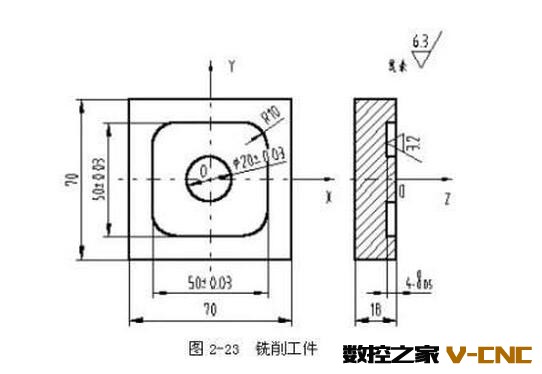 毛坯为70㎜×70㎜×18㎜板材,六面已粗加工过,要求数控铣出如图3-23所示的槽,工件材料为45钢,