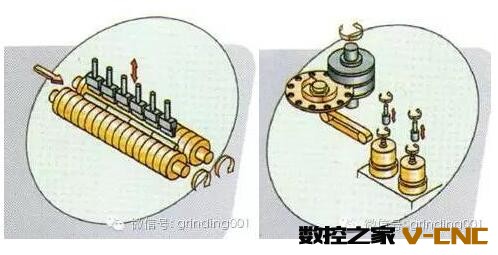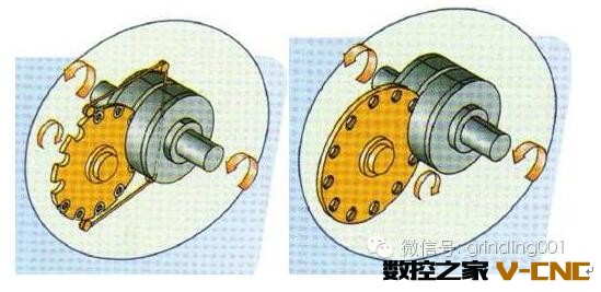 这里所讲的砂轮开槽,不是指对砂轮整个磨削面进行开槽,前面讲到了要使砂轮有好的排屑效果,把砂轮型面做成蜂窝孔形式。在卧式双端面磨削中,这还不够,一般都要 对砂轮中孔周围切割开槽,原因有两点: