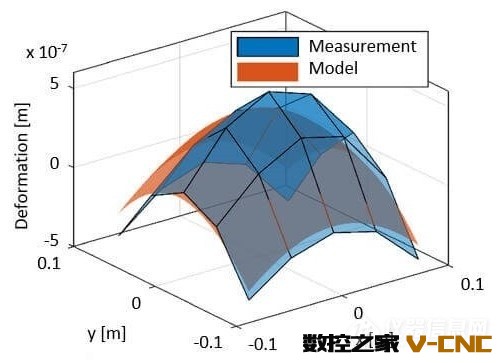 半导体光刻系统中的晶圆级轻量化移动结构的变形阻碍了高通吐量的半导体制造过程。为了补偿这些变形,需要精确的测量由光压产生的形变。来自世界顶尖理工大学荷兰Eindhoven University of Technology 的科学家设计了一种基于德国attocube干涉仪IDS3010的测量结构,以此来详细地研究由光压导致的形变特性。图2.1所示为测量装置示意图,测量装置是由5 x 5 共计25个M12/F40激光探头组成的网格,用于监测纳米级的无轴承平面电机内部的移动器变形。实验目的是通过对无轴承平面的力分布进行适当的补偿,从而有效控制转台的变形。实验测得最大形变量为544 nm,最小形变量为110 nm(如图2.2所示)。