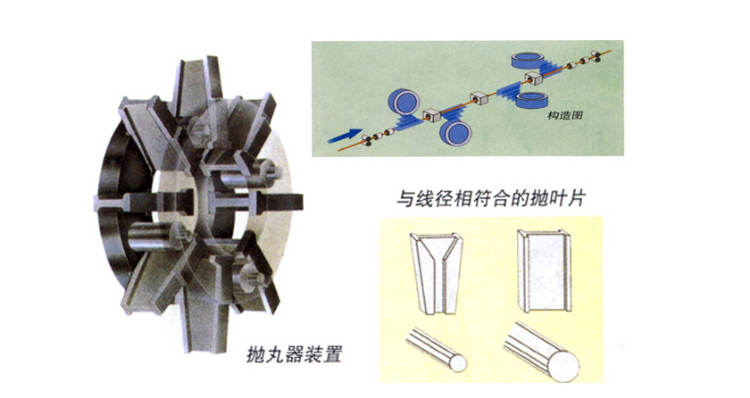 1. 线材抛丸机采用新型高效无护板电机直联式抛丸器,同等功率下抛丸量大,弹丸速度快〔弹丸速度大于80米/秒〕。我公司生产的线材抛丸机采用双叶轮,叶片槽道收口式,增大弹丸抛射线材上打击密度,加大打击力度,提高清理效果,同时具有叶片更换方便、唯修简单等优点,更换叶片只需3~6分钟。