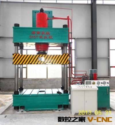 三梁四柱液压机 YB32系列 315,500,630,1000吨适用于可塑性材料的压制工艺,如冲载、弯曲、翻边、薄板拉伸等。也可从事校正、压装、砂轮成型、冷挤压金属零件成型,塑料制品及粉末制品的压制成型工艺,配上冲裁缓冲装置后可用于冲孔、落料加工。本机器具有独立的动力机构和电气系统,并采用按钮集中控制,可实现调整、手动和半自动三种操作方式。