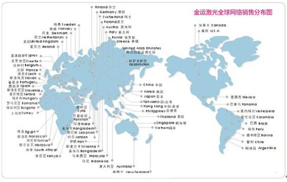 ★公司销售网络范围 凭借产品的高性价比、国际化的经营策略和模式,完善的销售与服务网络,金运激光正矢志不移的以高新的技术力量和品牌策略支撑着中国的民族激光产业。 雄厚超前的研发实力和以市场为导向的创新体系,保证了产品的**地位和卓越品质,同时也让金运产品风靡全球。金运用户遍布全国各地,并已在上海、天津、重庆、四川、广东、浙江、江苏、福建、山东、湖北、河北、辽宁等地建立了多个完备的销售及服务网点。
