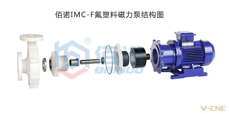 7.内外磁选用钕铁硼材料,磁钢表面高达3600高斯,可顺利把原动机的扭矩传递给叶轮,并且在大流量工况下也不会打滑,也可防止叶轮内转子与后止推环接触,从而防止因摩擦发热而融化氟塑料部件,确保磁力泵在强腐蚀性的场合能正常运行;